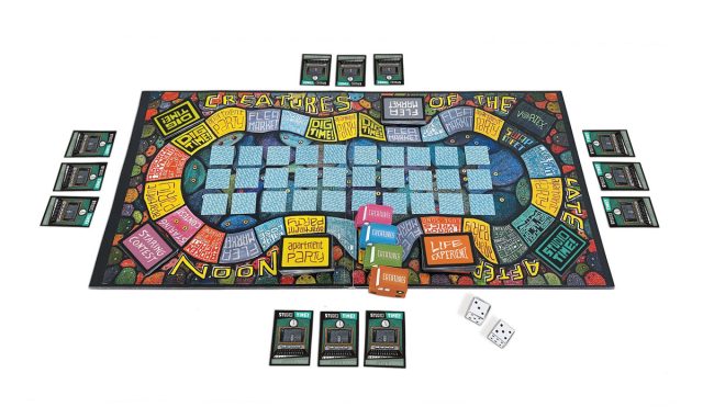 So you need to find a creature that plays bass, a creature that sings, a creature that plays the drums, and then you go to the flea market and pick up bits of recording equipment and musical instruments and whatnot. Then you collect a set of cards, including studio time. There are moments on the board that set you back a bit, but then you get some life experience.